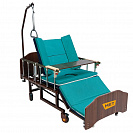 По краям кровати расположены специальные отверстия (4 штуки) для установки инфузионной стойки и других принадлежностей. В комплект входит инфузионная стойка, ванночка для мытья головы, а также штанга для подтягивания больного с регулируемой по высоте рукояткой.