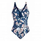 Современный закрытый купальник с пестрым привлекательным принтом в синих тонах и экстравагантной выкройкой модели. Купальник снабжен высоким вырезом на груди, который скрывает следы операции. Лиф модели дополнен мягкими чашечками с тканевыми вшитыми кармашками, которые плотно держат протез и корректируют форму груди.